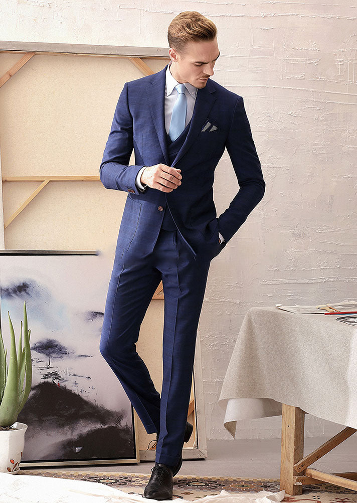 Perfect for office wear or formal occasions, the fabric's elegant glen plaid pattern adds depth without being overpowering. This blue plaid men’s suit combines durability with subtle sophistication, making it a timeless addition to any gentleman's wardrobe.